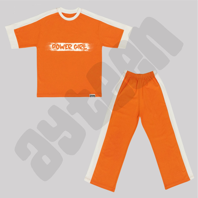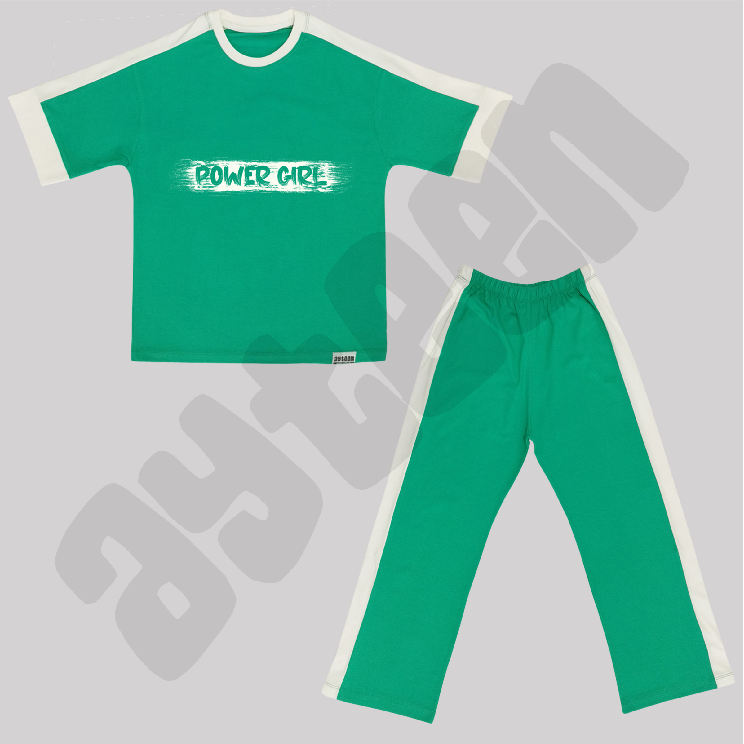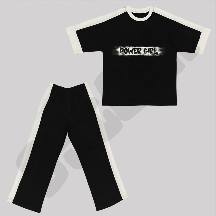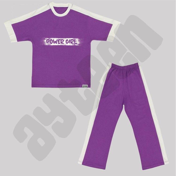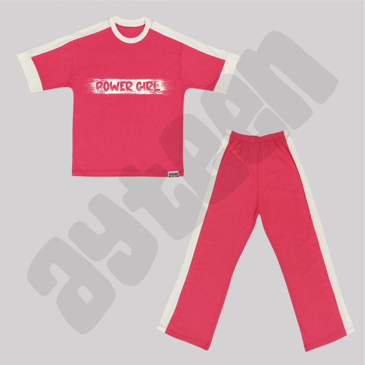 ست دخترانه آستین کوتاه و شلوار بغل نوار طرح powergirl