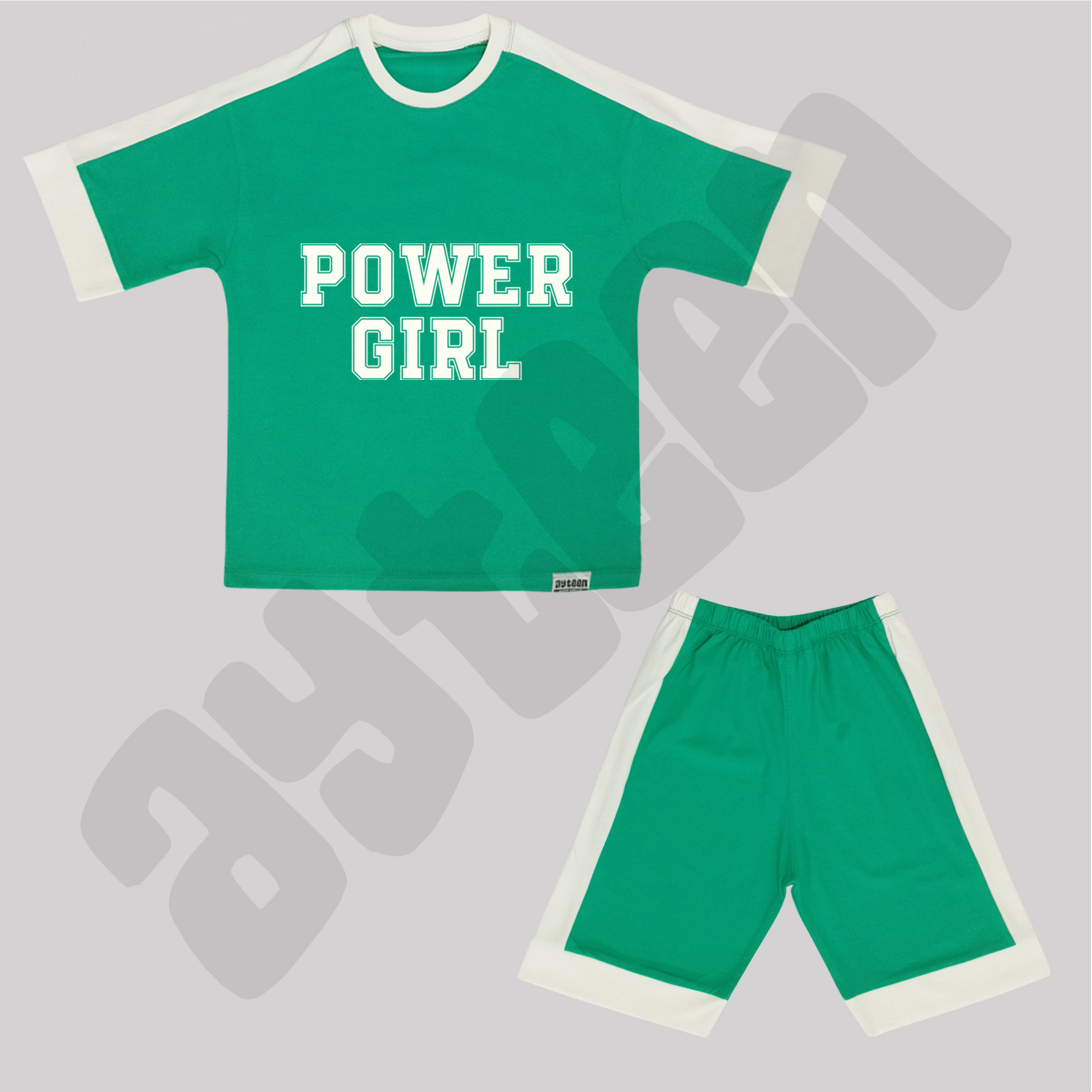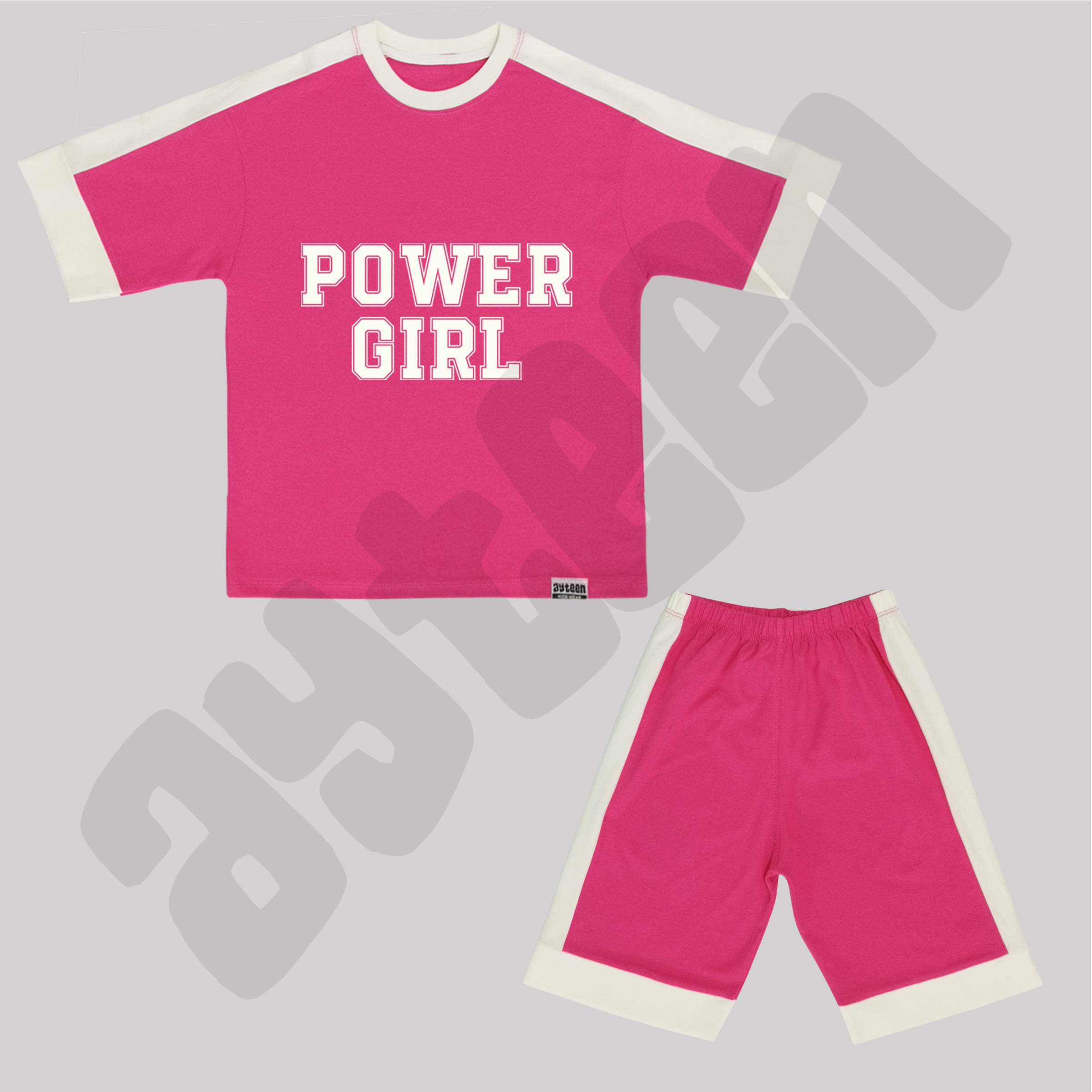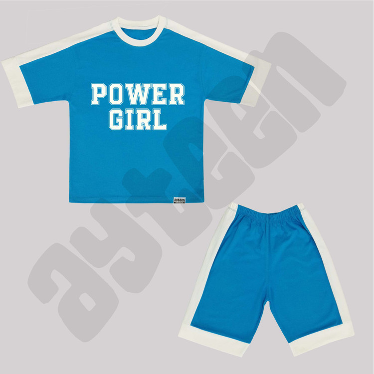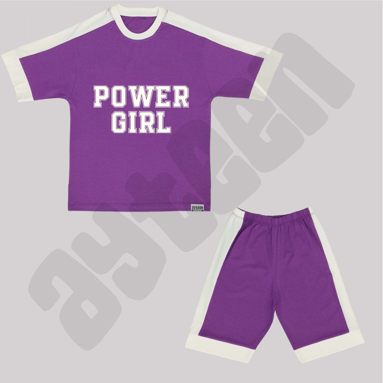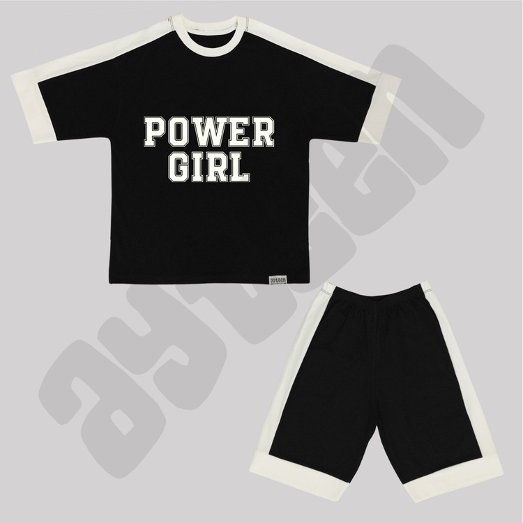 ست دخترانه آستین کوتاه و شلوارک بغل نوار طرح POWER GIRL